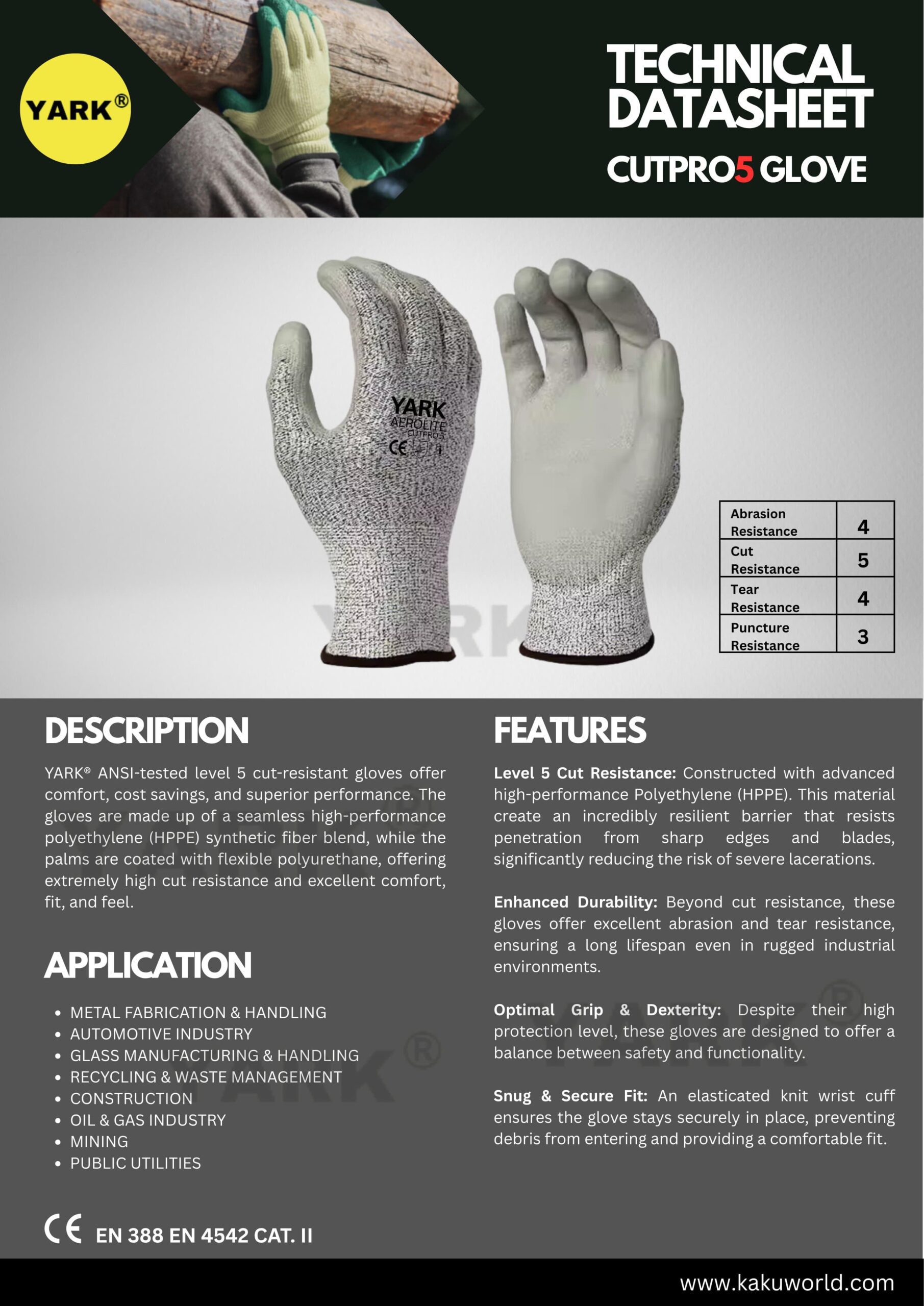 Cut5 gloves.The YARK® CUTPROS Gloves are ANSI-tested, EN-certified Level 5 cut-resistant gloves engineered for maximum protection without compromising comfort or dexterity. Made with a seamless high-performance polyethylene (HPPE) synthetic fiber blend and reinforced with a polyurethane-coated palm, these gloves provide outstanding cut resistance, durability, and grip — making them the ideal choice for high-risk industrial environments.