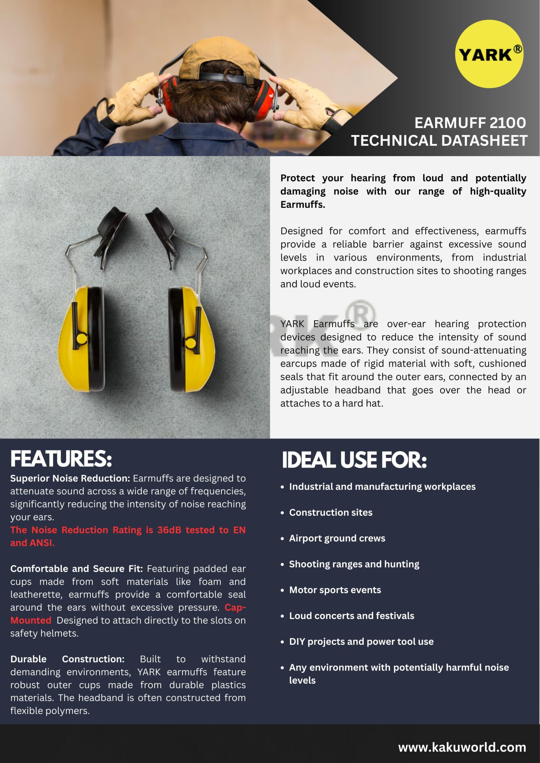 EARMUFF HELMET MOUNT.The YARK® Earmuffs provide dependable hearing protection in environments where loud and potentially damaging noise is present. Designed with cushioned seals and adjustable headbands, they combine comfort with effectiveness, ensuring long-term wearability in industrial, recreational, and personal settings. With a Noise Reduction Rating (NRR) of 36 dB tested to EN and ANSI standards, these earmuffs offer superior protection against excessive sound levels.