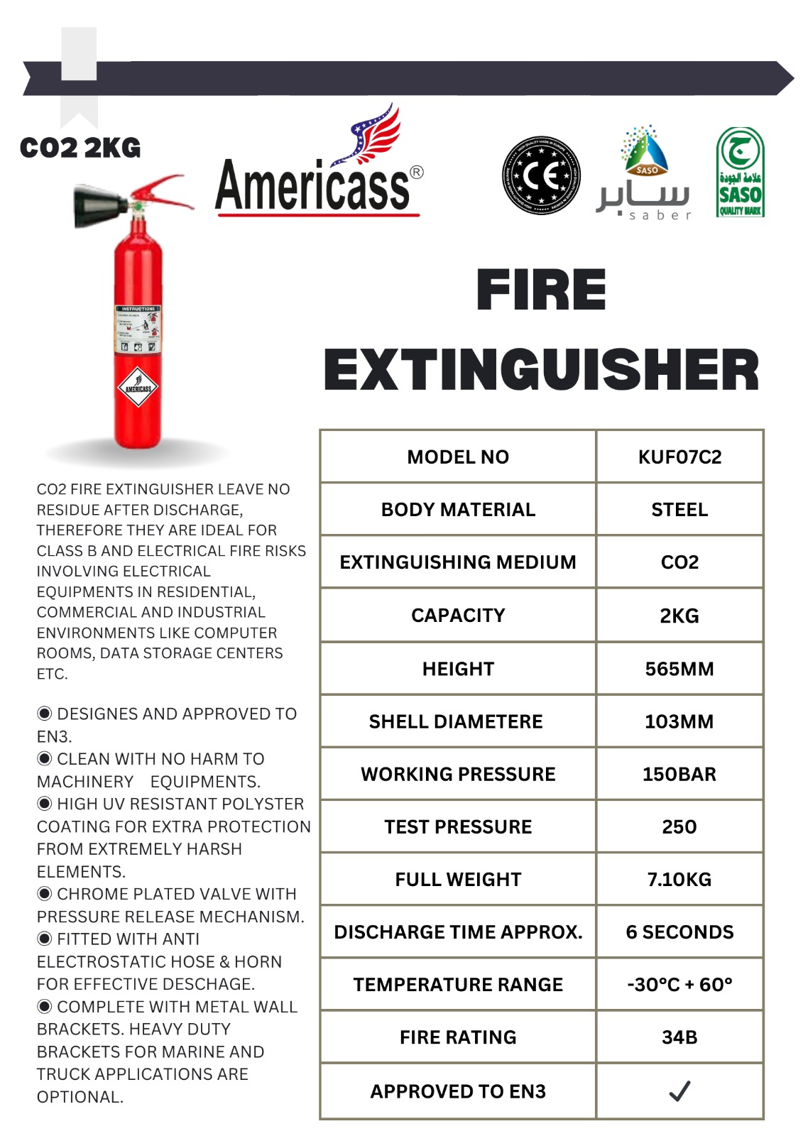 • Certification: EN3 Approved, SASO Quality Mark