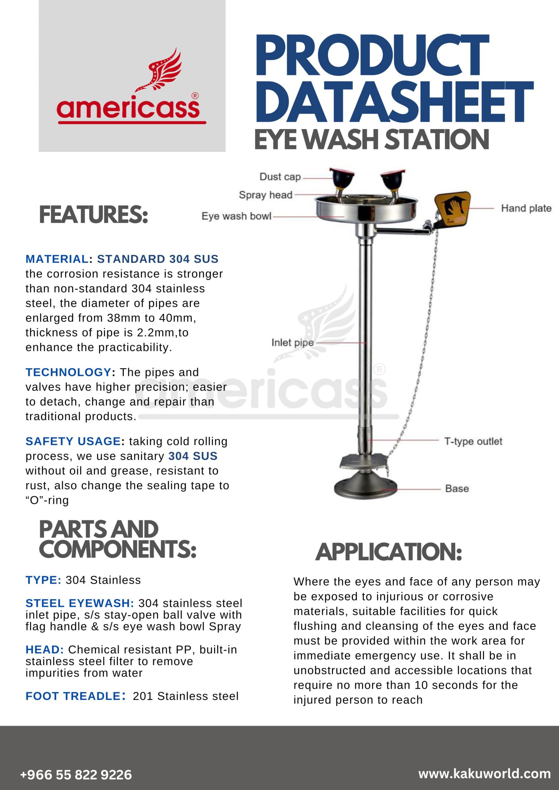 EYE WASH FLOOR MOUNTED SHOWER SS.The 304 Stainless Steel Eyewash Station is designed to provide immediate flushing of eyes and face in the event of exposure to corrosive or hazardous materials. Manufactured from standard 304 SUS stainless steel, with enlarged 40 mm pipe diameter and 2.2 mm pipe thickness, it offers greater durability, corrosion resistance, and enhanced practicability compared to conventional models. Engineered with precision valves, easy maintenance, and a hygienic finish, this eyewash station is ideal for laboratories, factories, refineries, and chemical handling facilities.