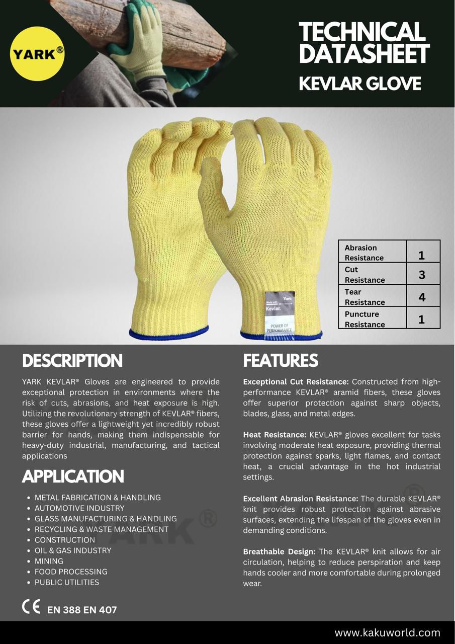 The YARK® Kevlar Gloves are engineered to deliver exceptional protection in demanding industrial environments where the risks of cuts, abrasions, and heat exposure are high. Made from advanced KEVLAR® aramid fibers, these gloves offer a unique balance of strength, heat resistance, and comfort, making them ideal for heavy-duty applications across a wide range of industries.