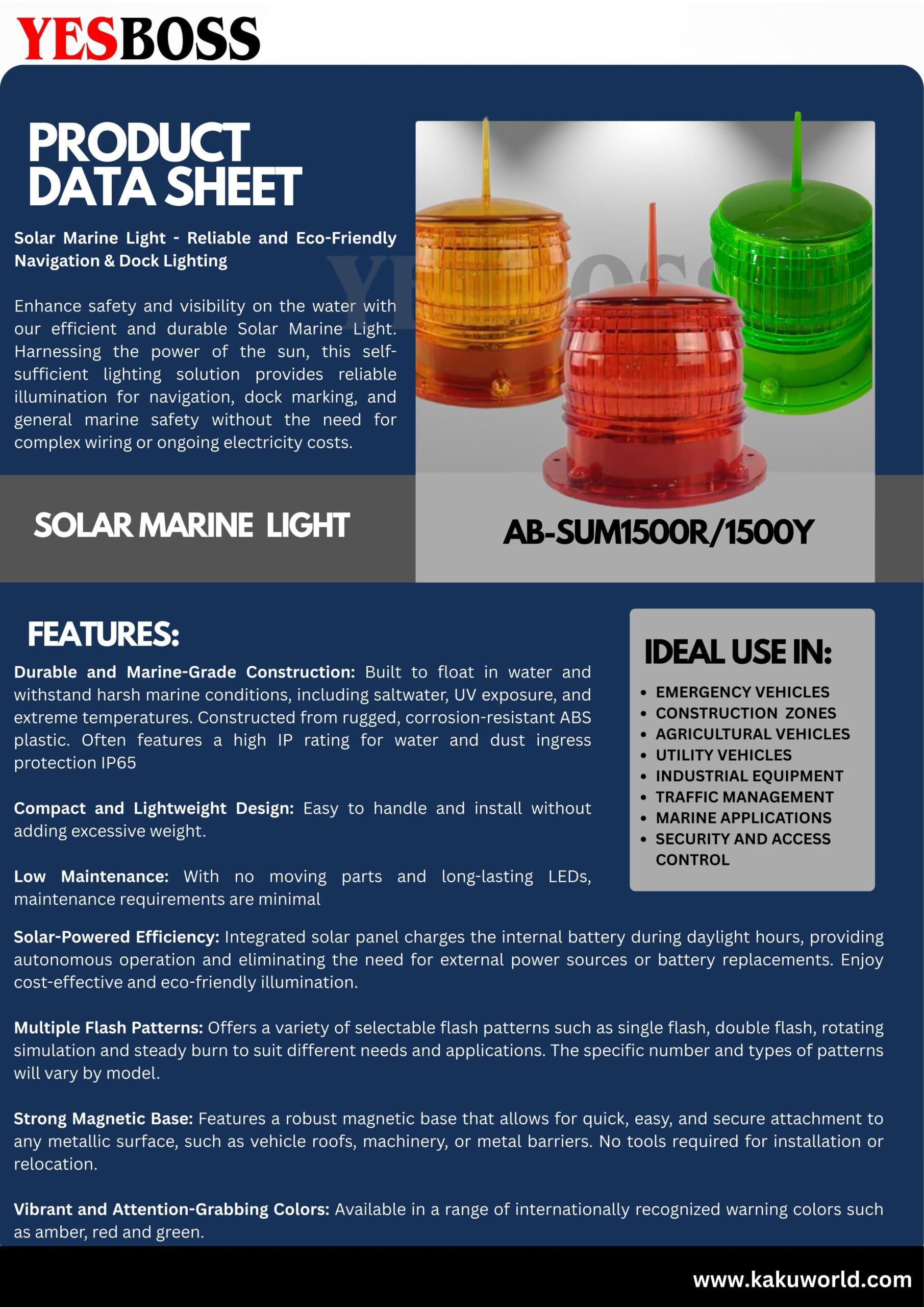 Marine Light.The AB-SUM1500 Series Solar Marine Light provides a durable, solar-powered lighting solution specifically designed for marine and coastal environments. Built from marine-grade ABS plastic and resistant to saltwater, UV exposure, and extreme weather, it offers reliable illumination for navigation, dock marking, and hazard signaling without wiring or ongoing power costs. With multiple light colors and flash patterns, this eco-friendly beacon enhances visibility and safety on the water.
