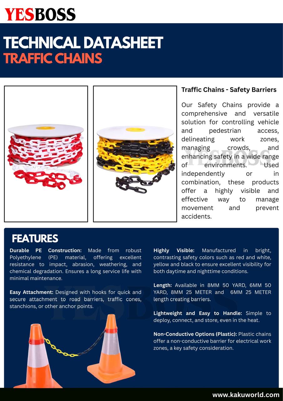 These High-Visibility Traffic Safety Chains are designed for effective and flexible crowd control, traffic management, restricted access marking, and hazard zone separation. Manufactured from premium-grade Polyethylene (PE) material, the chains offer excellent durability, weather resistance, and long service life under demanding outdoor and indoor conditions.