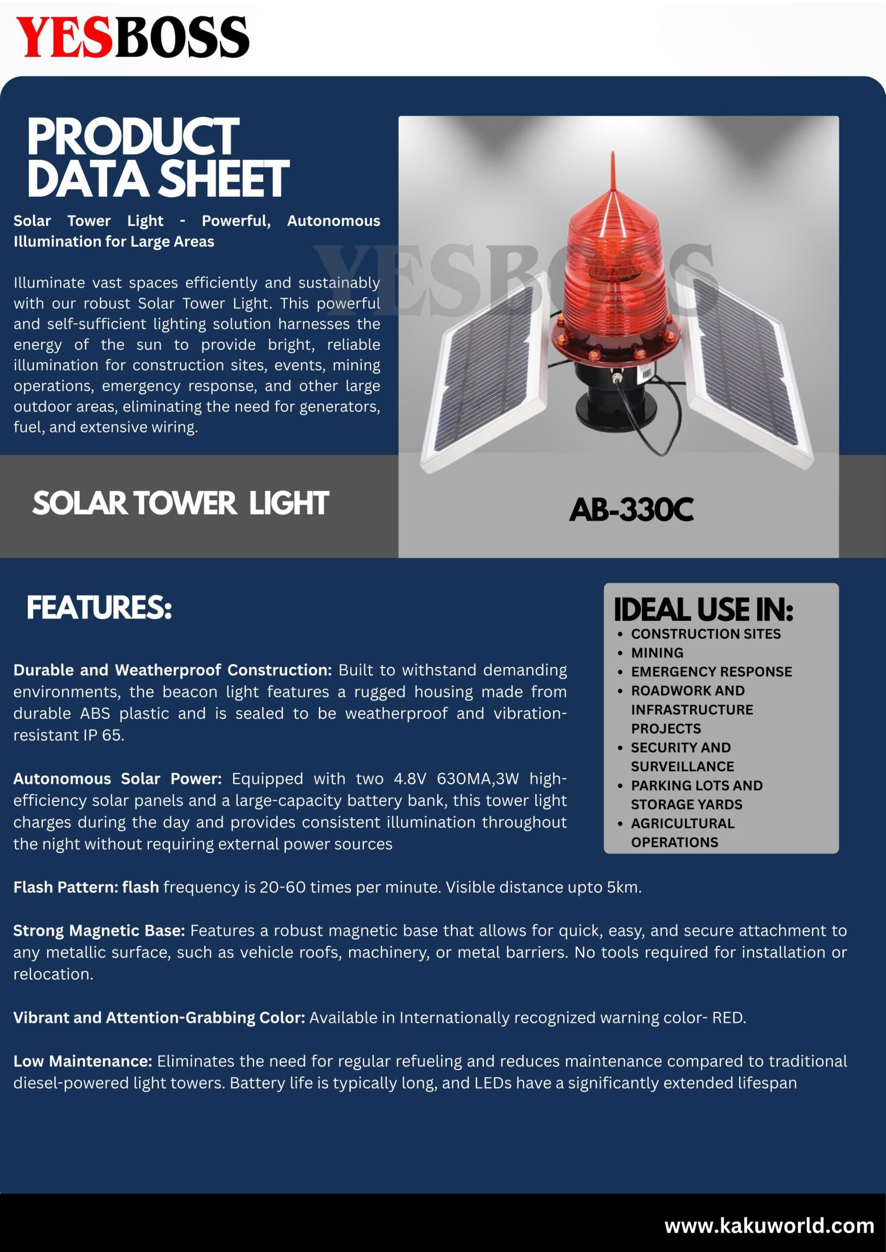 Solar Tower Light.The AB-330C Solar Tower Light is designed to provide bright, sustainable illumination across large-scale outdoor environments without the need for generators, fuel, or wiring. Powered entirely by high-efficiency solar panels and a large-capacity battery bank, it delivers dependable lighting for construction sites, mining operations, emergency response, and security zones. With rugged durability, low maintenance, and long-lasting LED performance, it offers a cost-effective and environmentally responsible alternative to diesel-powered light towers.