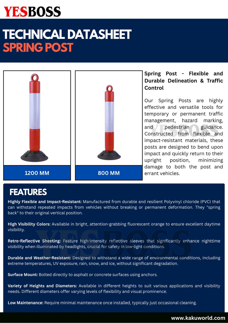 The YESBOSS Spring Post is a highly durable, flexible, and impact-resistant delineation device designed for temporary or permanent traffic guidance, hazard marking, and pedestrian direction. Its advanced flexible PVC body allows it to bend under impact and spring back to its upright position, minimizing damage to both vehicles and the post itself. Suitable for road construction zones, parking areas, lane separation, pedestrian routes, and industrial safety applications.