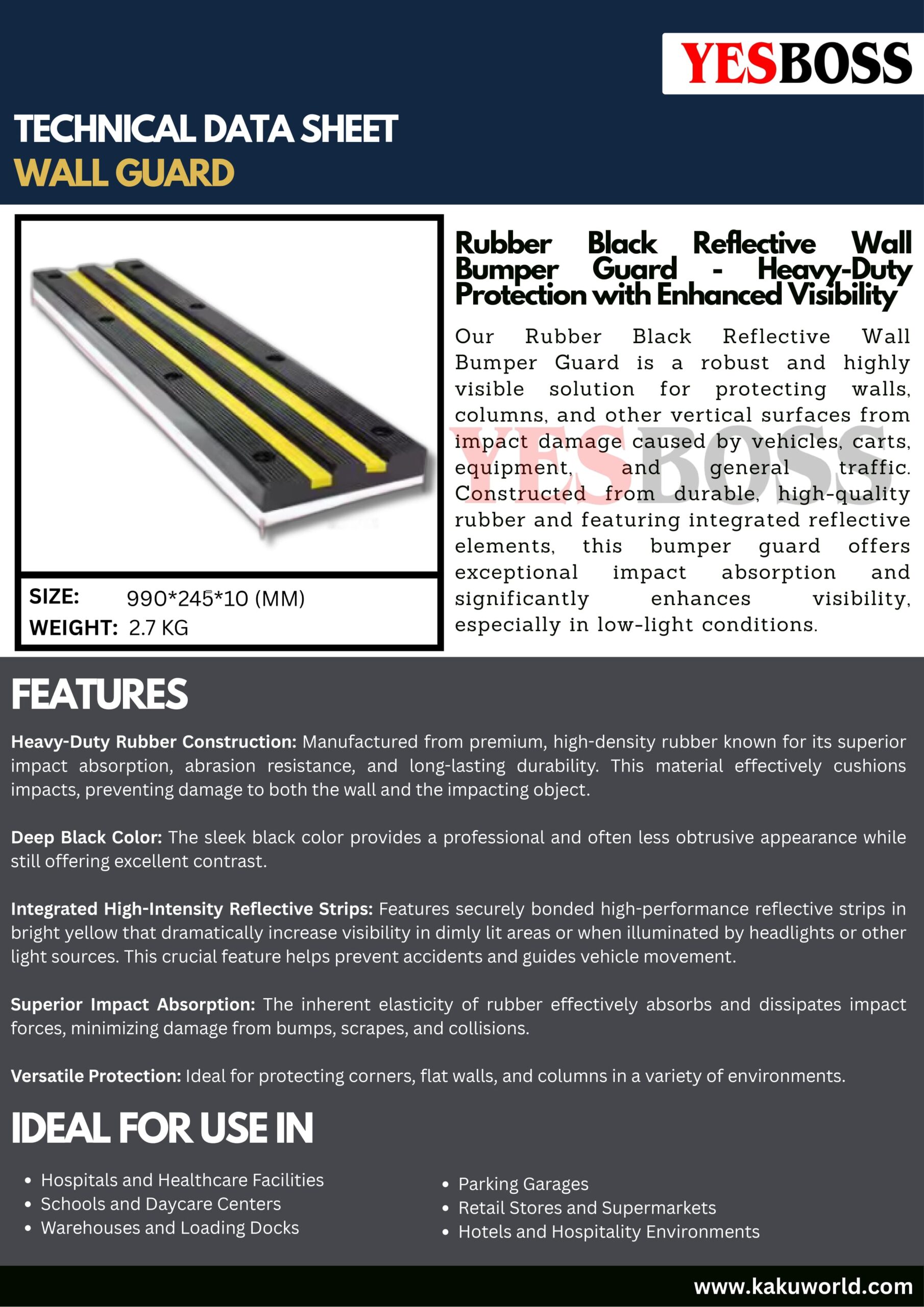 Protect your walls, columns, and vertical surfaces from impact damage with the YESBOSS Rubber Reflective Wall Guard. Designed with durability and visibility in mind, this wall bumper guard is made from premium high-density rubber and includes bright reflective strips to enhance safety in low-light environments.