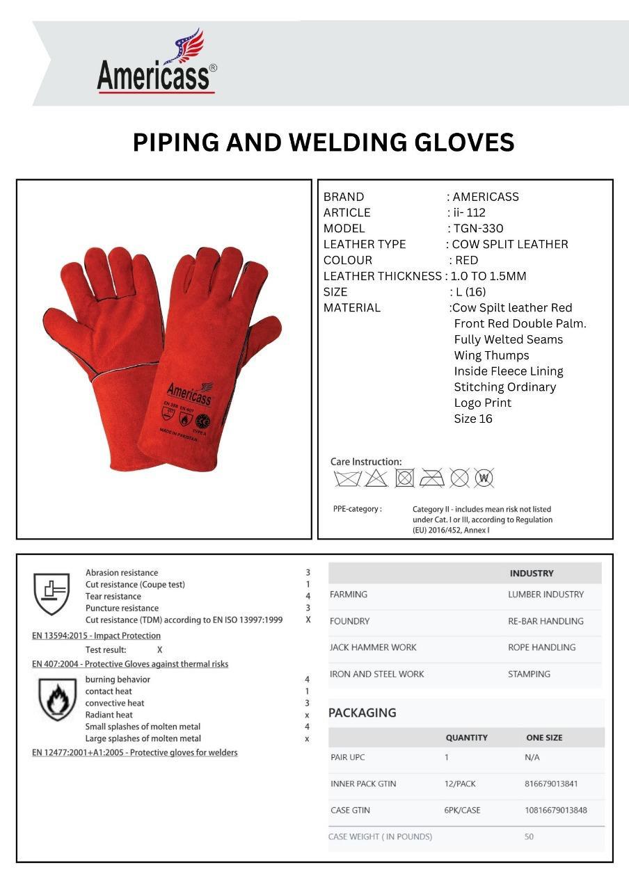 The Americass TGN-330 gloves meet several key EN safety standards for mechanical and thermal performance. They offer reliable protection against abrasion, tearing, puncture, contact heat, radiant heat, convective heat, and molten metal splash, ensuring suitability for welding, foundry operations, iron and steel work, and other high-temperature applications. With certified impact protection and compliance under PPE Category II, these gloves are built for users who require consistent, certified performance.
