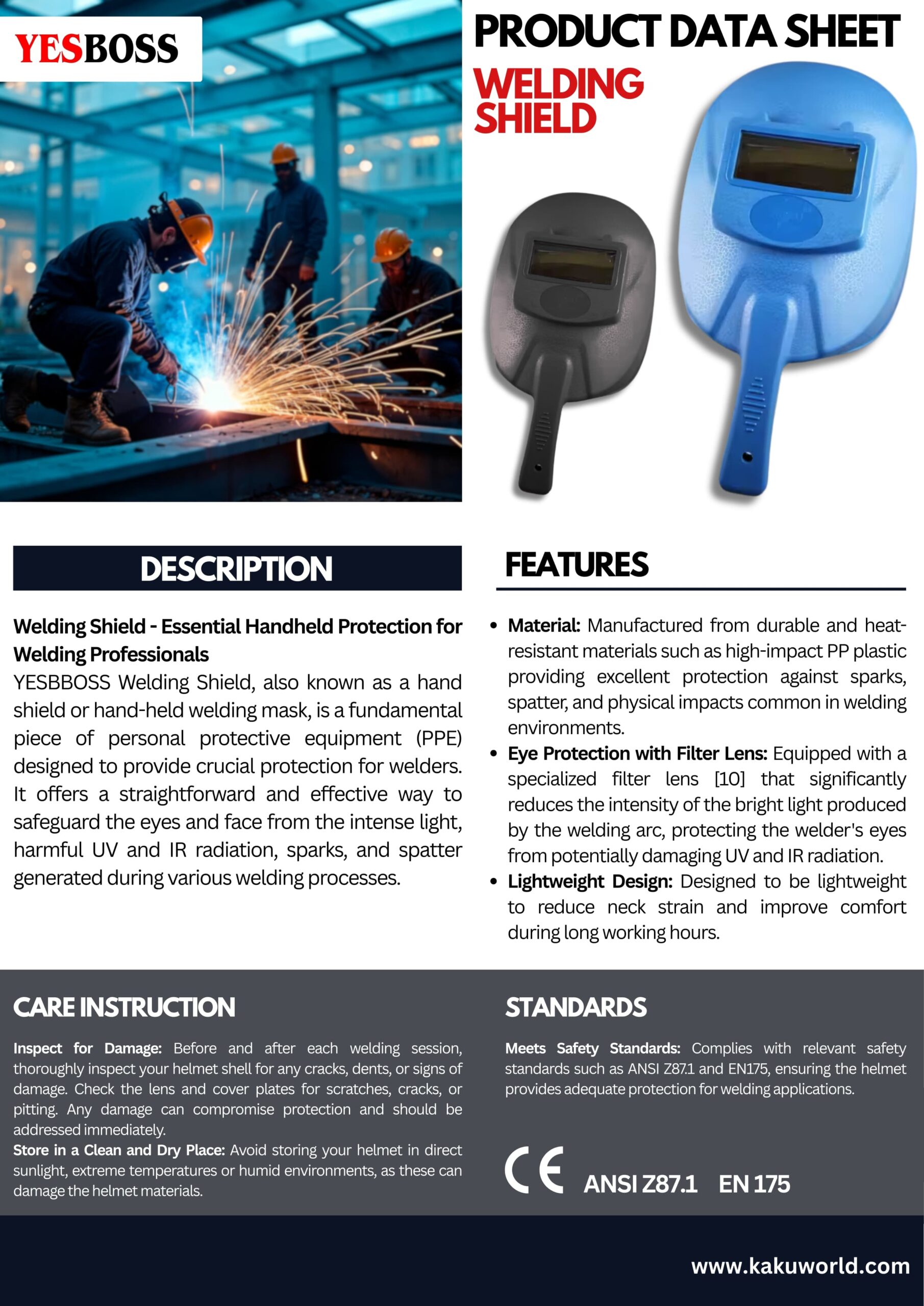 WELDING SHIELD.The YESBOSS Welding Shield, also known as a handheld welding mask or hand shield, is a fundamental tool in welding safety. Designed to deliver reliable protection during welding operations, it shields the face and eyes from intense arc light, UV/IR radiation, sparks, and hot spatter. Its lightweight, ergonomic design allows for precise control and comfort, making it ideal for short welding tasks, inspections, and environments where a full helmet is not required.