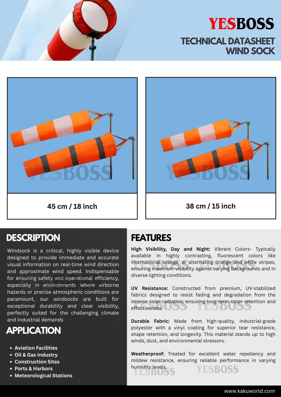 The YESBOSS® Double-Color Windsock is a premium-grade wind direction and wind-speed indicator designed for aviation, industrial, and safety-critical environments. Manufactured with alternating orange and white reflective stripes, this windsock ensures maximum visibility in both daytime and low-light conditions.
