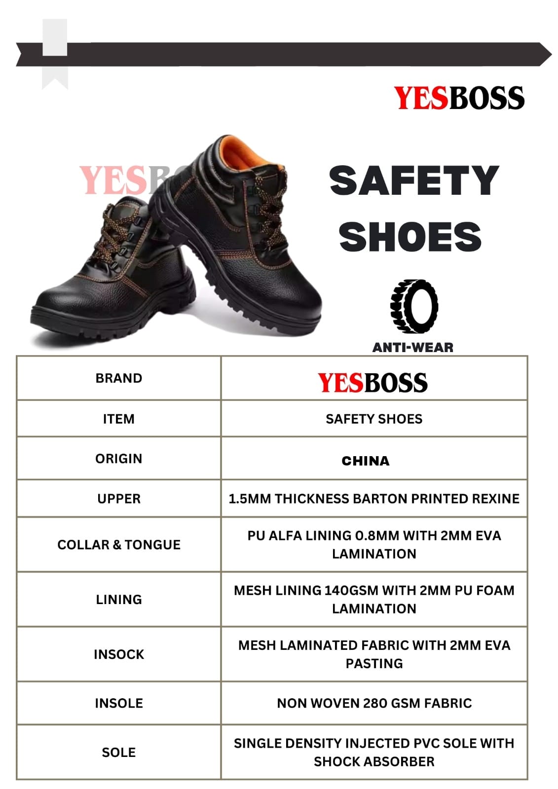 - Sole: Single density injected PVC sole with shock absorber